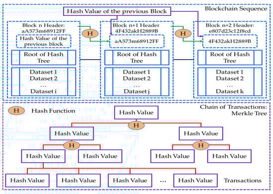 Blockchain technology can be defined as a growing list of records, which are known as blocks. The innovation of blockchain technology, beyond the creation and maintenance of a continuous list of records, is the improvement of digital transaction security and anonymity based on the implementation of cryptography algorithms. For a peer to insert a new block into the blockchain, that specific block must be followed by a cryptographic hash (i.e., a unique code) that is connected to the preceding block. Each new block consists of two key parts, namely the block header and the block body. The structure of the block header includes the version number, a timestamp, a target hash bit of the current block, a nonce, the hash value of the previous block, and a Merkel root. The detailed data of transactions are stored in the block body. More specifically, additional attributes, such as a timestamp, and transaction data are also included in the new block, thus ensuring the continuity of the information. Consequently, it becomes apparent that the blockchain is by definition resistant to modification of its data. Timestamping and hashing processes are required before a new block is added to the chain; thus, the data of the blockchain can be traced back and are transparent to everyone who participates in the blockchain. Essentially, the blockchain can also be considered a distributed, shared database. In Figure 1, the operating principle of the blockchain for the addition of new blocks is described.