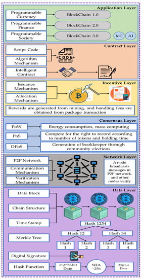 The infrastructure of the blockchain can be realized as a six-layer framework (Figure 2), namely (i) application, (ii) contract, (iii) incentive, (iv) consensus, (v) network, and (vi) data layers. More specifically, in the application layer, a plethora of application scenarios are included. Then, the contract layer compiles the necessary algorithmic backend, e.g., code scripts, algorithms, and smart contracts. The incentive layer is used in conjunction with the consensus layer to ensure the reward of each node for the work accomplished on the network. The latter can be realized by the issuance of tokens to the miners after the completion of their task. Among the most important layers is the consensus layer, which encapsulates the consensus mechanism. The consensus mechanism is important in the current blockchain implementations (i.e., permissioned blockchains) since it provides the necessary framework for all the participants of the blockchain (i.e., the nodes) to achieve agreement. It is stressed that two types of blockchain exist considering the admittance of new nodes: permissioned and permissionless blockchain [1,2,3]. The network layer consists of the networking functionalities required for the communication between the nodes, the data exchange framework, and the data verification framework. Finally, the data layer encapsulates the data included in the blocks and supports the encryption and timestamp processes.