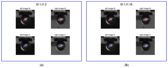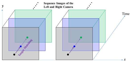 As a third step, to measure the instantaneous displacement of the bridge, it is necessary to obtain 3D coordinates of all the targets on the stereo sequence images using the left and right cameras. These are determined based on the space intersection with the pre-identified IOPs and the scale-adjusted ROPs, and the corresponding image coordinates and (i = number of cameras, j = number of frames, k = number of targets). The target’s image coordinates of the first stereo frames are obtained manually. From the second stereo frames, the target-matching technique automatically traces the target’s image coordinates for all frames (Figure 3). In this study, target-matching based on the normalized cross correlation and the least-squares-technique was carried out with the first frames as a reference, and the new location of targets was obtained from the next frames [39]. The target matching based on the two matching method is for better sub-pixel image matching. The least square matching can overcome the brightness difference and geometric image distortion between the target and reference images.
