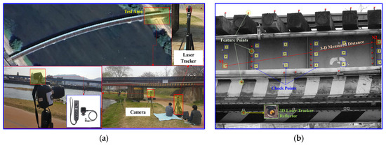 (a) Test span of the curviform railway bridge in Suncheon of South Korea, two-camera setup with a remote controller and two receivers, laser tracker; (b) layout of 26 feature points and 18 target checkpoints on the test span bridge, N1 and N2 points used to adjust the scale of the ROPs, the zoomed-in view of a laser reflector in the lower left part of the bridge.