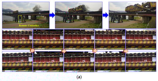 Using two cameras with a remote controller and two receivers, photographs were taken as three types of trains entered the bridge. At several-second intervals, two maintenance trains were each captured with five photographs, and the passenger train was captured with six photographs. The first maintenance train entered the test area from left to right, and the other trains entered from right to left, as shown in Figure 5. In a previous experience, we analyzed vibration by the photographing moment with a remote control and camera shake due to ground vibration when a train passed over the bridge, but there was almost no influence in the change of the image coordinates.