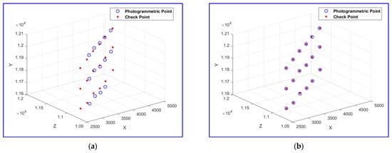 Eighteen target checkpoint locations before and after scale adjustment of the relative orientation parameter. (a) Before scale adjustment; (b) after scale adjustment.