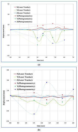 This study also extracted and compared only the same time-step points among the laser tracker measurements as the proposed method’s measurements, as shown in Figure 9. In the Y direction, the deformation shapes are substantially similar between the proposed method and laser tracker results, while it is slightly different in the X direction. Specifically, it shows a relatively large error in the Z direction. These causes are the low performance of the camera including the calibrated IOPs, target matching errors of feature points on the bridge surface used to determine ROPs, and incomplete time synchronization, even though stereo images from both cameras were taken simultaneously by a remote control. Nevertheless, it was observed that the displacement forms of the proposed method are similar to the results of the laser tracker in the X- and-Z axes enlarged to a 0.1 mm scale. Therefore, it seems to be the case that the displacement values of the proposed method are exaggerated because the real size of one pixel is about 1 mm, and the ROPs scale error is caused through the photogrammetric process as mentioned above, but the displacement directivity is relatively accurate.
