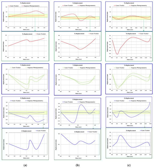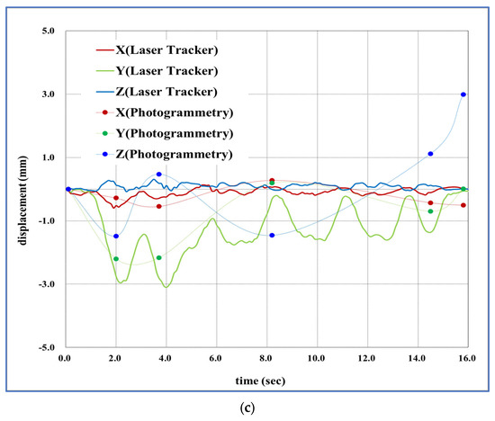 Displacement results of a reflector position in 3D directions by the laser tracker and the proposed method. (a) First train; (b) second train; (c) third train.