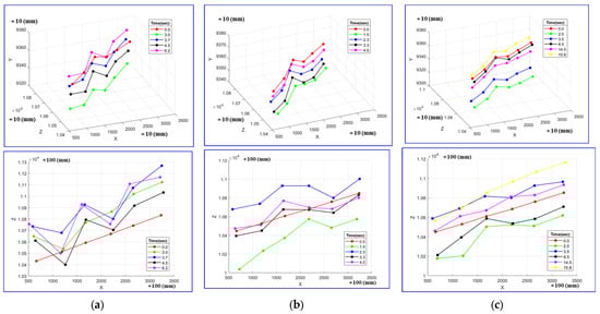 Consecutive deformation patterns during the loading of the train measured by the proposed method. The 3D space (top) and X-Z plane (bottom) displacements are magnified by 10 and 100 times, respectively, and color represents time. (a) First train; (b) second train; (c) third train.