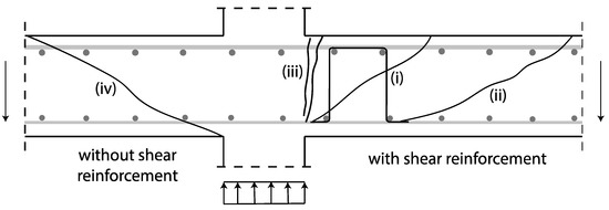Scheme of the typical crack formations of punching shear failure modes: (i) inside and (ii) outside the zones of punching shear reinforcement, (iii) at maximum punching shear capacity and (iv) without punching shear reinforcement (adapted from [2]).