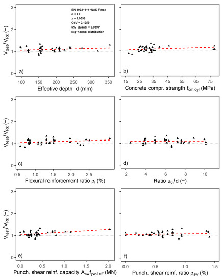 Another relevant basic variable is the model uncertainty. The model uncertainty generally accounts for effects that are neglected in model simplifications and mathematical relationships (e.g., [40,41]). As previous studies already demonstrated (e.g., [18,40,41]), uncertainties in resistance models can play a significant role in structural safety evaluations and the calibration of partial factors in semi-probabilistic designs and, therefore, their thorough consideration is critical for the feasibility of any reliability-based investigation. According to the JCSS Probabilistic Model Code [38], the model uncertainty variable is typically characterised by a lognormal distribution. Nonetheless, in the context of this investigation, this assumption needed to be properly evaluated. Thus, the statistical parameters of the distribution function describing the model uncertainty were estimated from the data stored in the experimental database described in Section 4.1. To this end, the theoretical (i.e., predicted) punching shear resistance (according to DIN EN 1992-1-1+NA(D) [4,5,6,7]) was compared with the experimental failure loads. Note that for the comparison, the punching shear was used, all the partial factors in the design equations were taken as unity and the mean value of concrete compressive strength (for cylinders) was adopted. Then, the statistical parameters of the related resistances were determined under the assumption of both the normal and lognormal distributions. By doing this, the quotients of the experimental failure loads and the theoretical punching shear resistances were determined.