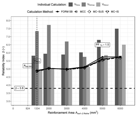Figure 4, Figure 5, Figure 6 and Figure 7 show the results of the system reliability analyses for varying amounts of punching shear reinforcement. Each system reliability was calculated according to the methods described in Section 4.3.2 for different partial factors for concrete . The grey columns of Figure 4, Figure 5, Figure 6 and Figure 7 respectively refer to the three failure modes discussed in Section 1: (failure mode (i)), (failure mode (ii)) and (failure mode (iii)). The variation of the amount of punching shear reinforcement considered in the analysis range between a minimum of 824 mm2, which was determined according to DIN EN 1992-1-1+NA(D) [4,5,6,7], and 6000 mm2. The target value of 3.8 was taken from DIN EN 1990 [22] and refers to the recommended value for a reliability class 2 (RC2) and a 50-year reference period. This RC2 is associated with the consequence class 2 (CC2), which is mostly related to common structures where the consequences of failure are medium (e.g., residential and office buildings, public buildings).