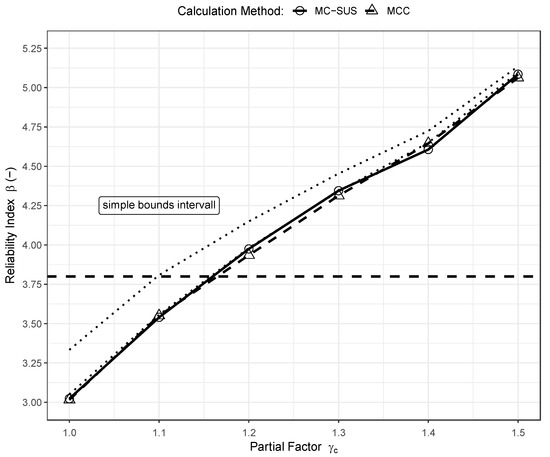 Focusing on the system reliability for a reinforcement area of 4000 mm2, Figure 8 shows the impact of varying the partial factors on the system safety level. Here it was visible that to ensure a safety level above the 3.8 threshold, the simple bounds (Figure 8, grey area) gave a relatively wide spectrum of possible “minimum” partial factors, which ranged between 1.10 and 1.17 (approximately). Furthermore, for a value of 3.8, the value obtained with the MC-SuS method seemed to be close to the lower bound of the simple bounds approach with a partial factor close to 1.17. The relatively wide spectrum of the simple bounds did not enable drawing a precise conclusion about the accuracy of these “minimum” partial factors. However, it should be highlighted that the interpretation of this value is solely based on a “medium” reinforcement amount (i.e., 4000 mm2). Nonetheless, addressing other reinforcement amounts and investigating additional variations is not only relatively easy with the use of advanced computation tools but also vital to avoid unsafe decisions regarding the selection of a partial factor. Furthermore, the results of this analysis also suggested that with slightly additional computational power, the use of a variance reduction technique (i.e., level III method) might lead to even more precise results.