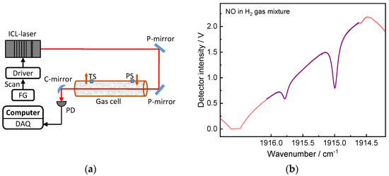 (a) The spectrometer’s experimental configuration for determining the pressure broadening coefficients, where PS: pressure sensor; PD: photodetector; FG: function generator; DAQ: data acquisition card; (b) Measured typical laser intensity with two NO absorption peaks.