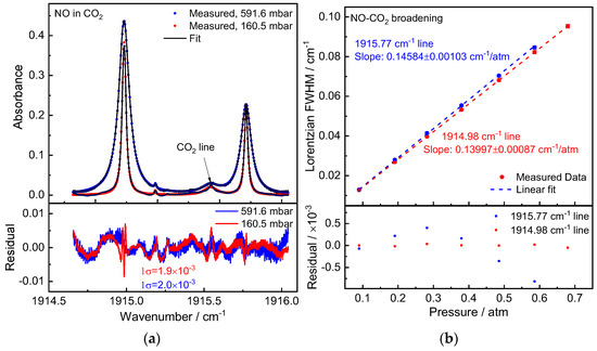 A NO/CO2 gas mixture was prepared using the above-mentioned gas mixture preparation procedure to derive the NO-CO2 broadening coefficient. Figure 2a depicts a subset of the measured NO/CO2 gas mixture line profiles at two pressures. The measured lines were averaged across 20 scans, and the Voigt model was fitted with a third-order background polynomial and a non-linear Levenberg–Marquart technique. Two absorption peaks were fitted simultaneously as well as a CO2 line between two NO peaks.