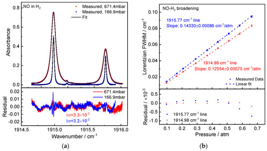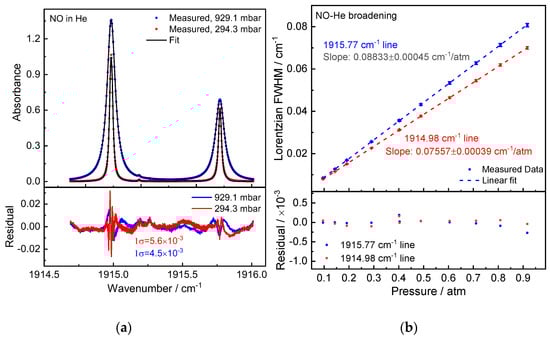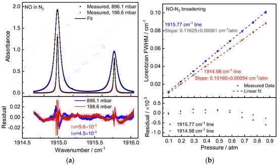 Figure 6a shows the measured NO absorption spectrum at pressures of 929.1 mbar and 294.3 mbar. The corresponding Lorentzian widths exhibit excellent pressure linearity. The experiments yielded the NO-He broadening coefficients γHe = 44.17(23) × 10−3 cm−1/atm and 37.79(22) × 10−3 cm−1/atm for Peak 1 and Peak 2, respectively.