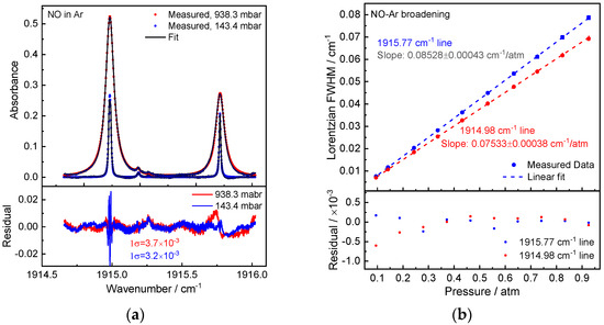 The same method was used to conduct the measurements of NO-Ar broadening. The spectrum treatment was the same as for measurements of CO2 and N2 broadening. Figure 4a shows the measured NO absorption spectrum in Ar (938.3 mbar and 143.4 mbar, 294 K), the fitting residuals were around (1σ) 3–4 × 10−3 (optical density). Figure 4 displays the measured Lorentzian widths at various pressures (b). For Peaks 1 and 2, respectively, the measured NO-Ar broadening coefficients from the linear fit slopes are γAr = 42.64(22) × 10−3 and 37.67(19) × 10−3 cm−1/atm. Additionally, the NO concentration measurement in the gas-phase oxidation of ammonia under 90% argon dilution determined in the temperature range of 1581–2720 K near 3 bar is being used and well validated with the evaluated Ar broadening coefficient data. More details on the measurement are available in the reference [27].