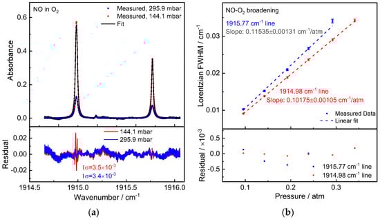 The measuring process for NO-O2 broadening was the same as for the other studies. Pure O2 was employed as the buffer gas here (purity 5.0, Linde). NO will react with O2 to form NO2 during the experiment as well as the gas mixture preparation process. NO concentration deduction was observed when filling O2 into the gas cell. The maximum pressure used in NO-O2 broadening measurement was less than 400 mbar. As an example, Figure 5a depicts an absorption spectrum of NO in O2 measured at total pressures of 144.1 mbar and 295.9 mbar. The observed spectrum was averaged over 20 scans, and the Voigt profile was used to fit it. The obtained NO-O2 broadening coefficient is γO2 = 57.68(66) × 10−3 cm−1/atm and 50.88(53) × 10−3 cm−1/atm for Peak 1 and Peak 2 according to the slopes of the linear regression of the Lorentzian widths versus pressures.