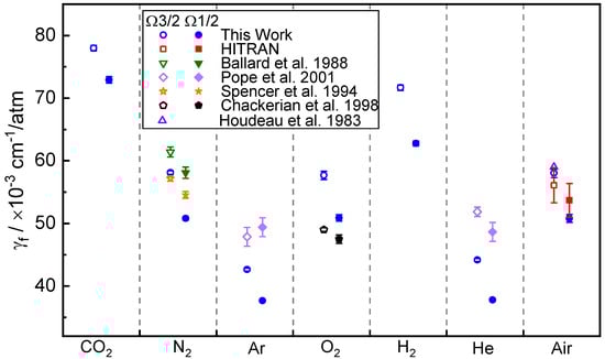 Table 2 summarizes our results at 294 K, along with the literature values of the NO (1←0) R11.5 (Ω3/2 and Ω1/2) lines from various published papers [20,28,29,30,31]. Note that we did not convert the broadening coefficients to the same temperature (at 300 K) as those in the literature for this comparison. The tabulated broadening coefficients are also shown in Figure 8. The different buffer gas means a different atom/molecule, and a different molecule has different collision frequency, energy and efficiency, which lead to different collision effects, and therefore, different broadening behavior. From the measurement results, the Ar broadening coefficient is the smallest, and the largest is the CO2 broadening coefficient. For NO-CO2 and NO-H2 broadening coefficients, there are no available reference data to compare. To the best of our knowledge, these two coefficients have not been reported before.