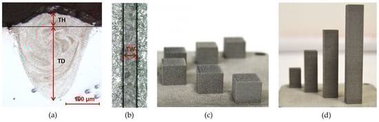 (a,b) Measured parameters of single track–track height (TH), track depth (TD), track width (TW), (c) bulk cube samples and (d) bulk cuboid samples.