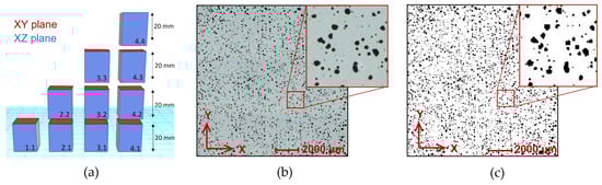 The relative density was evaluated on the cross-sections of the cube and bulk samples. The samples were metallographically prepared by wet grinding and polishing and observed by a light microscope (Zeiss Axio Observer Z1m, Oberkochen, Germany). The relative density of cube samples was observed in the XY plane. The bulk samples were analyzed in the three perpendicular planes to obtain the porosity distribution in the sample. The bulk samples were divided into smaller parts and then analyzed in the XY and XZ planes to obtain the pore distribution through the samples (Figure 3a). The relative density was measured by image analysis in the software ImageJ as a percentage of black color representing pores and white background color of the specimen material (Figure 3b,c).
