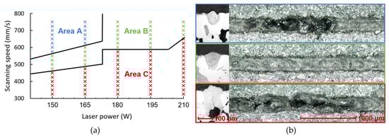 Based on the analyses and their comparison, 27 process parameters were evaluated as suitable for further testing (Figure 5). These are single tracks in the green area that show good cross-section shape and continuity. The balling effect, pores and cracking are not observed in them. These factors indicate a stable behavior of the weld tracks in their entire sample length. Similar results were obtained in the studies [17,18,19] for the magnesium alloys, where three areas that characterize almost identical defects in individual welds are also observed.