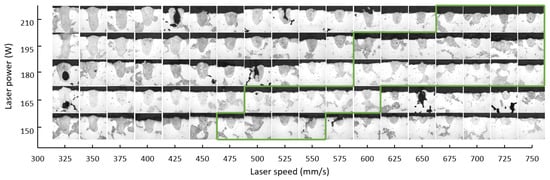 Metallographic images of single tracks for the entire experimental area. Green border represents parameters used for follow-up testing.