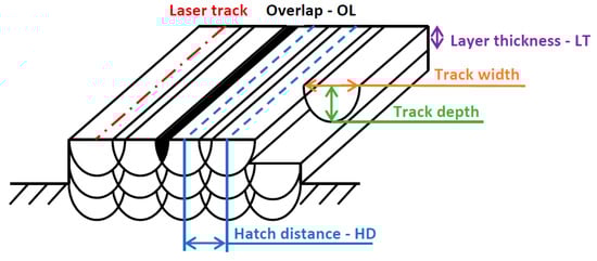 The depth of the weld tracks (TD, Figure 2a) is given by the laser melting mode (conduction or keyhole) [13], which is dependent on a number of parameters such as the type of material, the size of the particles used, the volumetric energy density and the absorptivity of the material. The absorptivity and vaporization play an important role in the transition from conduction to keyhole mode [14]. During the keyhole mode, the weld track is typically more unstable, and incomplete collapse of the vapor cavity leaves voids in the wake of the laser beam [15]. The track height (TH, Figure 2a) plays an important role in the built-up perspective. The collapsed/deepened tracks or very-low-height tracks should be eliminated from further use because, in follow-up layers, new material would not be built up and only overmelting and the gradual evolution of defects would occur. The width of the track (TW, Figure 2a) drives the hatch distance parameter when the volumetric material is built. Typically, 30–50% overlapping is used between neighboring weld tracks.