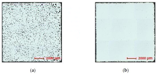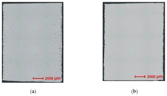 Representative images of the samples with the lowest and highest relative densities are shown in Figure 7. The highest relative density was achieved in sample 3-19 with the process parameters LP = 180 W, LS = 612.5 mm/s, HD = 0.133 mm and OL = 40%. These process parameters are used several times to avoid calculation and measurement errors in production of only one sample. On the other hand, sample 2-9 shows extensive porosity (Figure 7a) mainly consisting of spherical pores and voids with a size of 10–200 μm. The pores and voids are irregularly distributed throughout the sample volume. Local line alignment of the cavities can be observed, indicating the correlation of their formation with the laser beam track as a consequence of high input energy density [21,22]. The porosity of sample 3-19 is minimal (Figure 7b). Spherical pores with a size of about 10 μm occur mainly in the subsurface region of the sample. The AZ91D alloy investigated in the study by Wei et al. [23] shows a similar result with a relative density of 99.52% and an input energy density Ev = 166.7 J/mm3. In this case, the Ev value is several times higher than in the case of sample 3-19 (Ev = 44.19 J/mm3). The clear difference between the Ev values and the almost identical relative density can be explained by several factors. First of all, the different pieces of equipment used to produce samples must be taken into account. Additionally, the method of calculating Ev should be taken into consideration (Equation (2)), as the same Ev values can be obtained with different input parameters. Therefore, it is always necessary to compare the process parameters themselves. For sample 3-19, these are: LP = 180 W, LS = 612.5 mm/s, HD = 0.133 mm and LT = 0.05 mm, while in the case of Wei et al. [23], they are LP = 200 W, LS = 333.3 mm/s, HD = 0.09 mm and LT = 0.04 mm. From the process parameters, it can be seen that despite an almost identical relative density of the material, different microstructural properties can be expected.