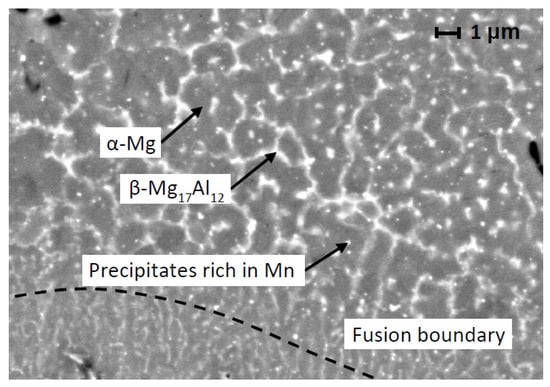 For a detailed assessment of the microstructure, an analysis using a scanning electron microscope (SEM) was carried out. Figure 13 shows the very fine microstructure of the material, consisting of the α-Mg matrix, divorced β-Mg17Al12 phase at the grain boundaries and very small, irregularly arranged, Mn-rich precipitates [27,28]. The image shows the difference in grain size in the area of the center of the solidified melt pool and at its edge (fusion boundary), where the microstructure is much finer. To determine the actual chemical composition of individual phases, energy dispersive spectroscopy (EDS) was performed (Table 8).