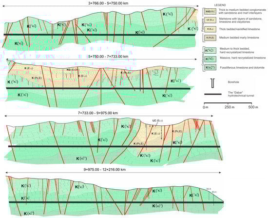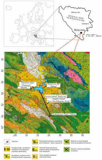- Jovanovski, M.; Peshevski, I.; Papic, J.; Susino, B. Report on Laboratory Tests of Shear Strength along Joints of Samples from Investigation Gallery in the Zone of Powerhouse and Pressure Tunnel H.P.P. Dabar; Faculty of Civil Engineering, Cyril and Methodius University: Skopje, North Macedonia, 2012. [Google Scholar]