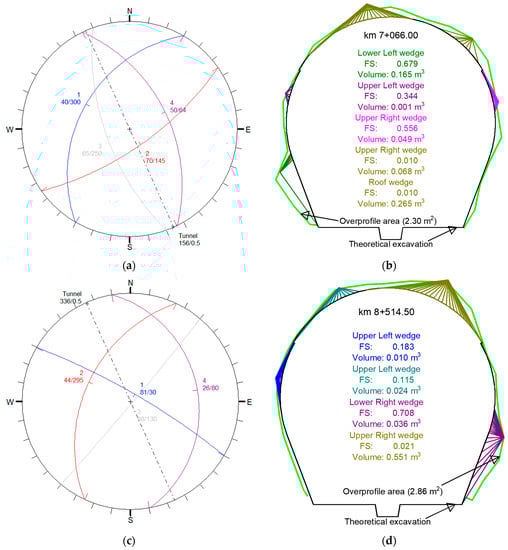 - The findings of the deterministic evaluation and probability analysis enabled a quantification of overbreaks using statistical analysis considering the large amount of data obtained for each mapped face: (a) rock mass quality (RMR value), (b) spatial discontinuity orientation, and (c) number of joint sets.
