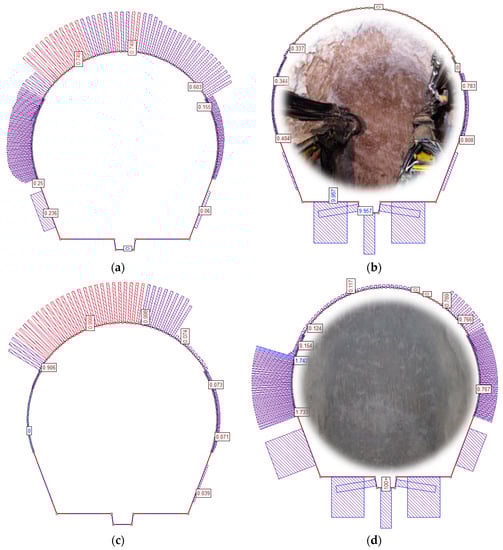 - Generally, from Figure 10a, it can be concluded that the geology is predominantly uniform, without significant deviations in the quality of the rock mass. Along the analysed tunnel section, the RMR value is in the range of 60 to 80, with an average of 65.
