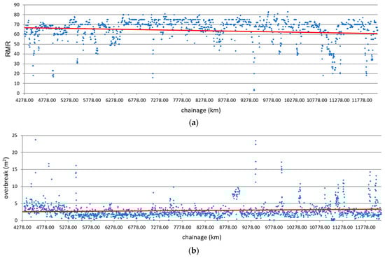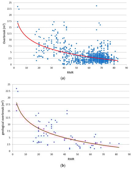 - Undoubtedly, the geological overbreaks that were geodetically surveyed in detail have the same general decreasing trend with increasing RMR value as the overbreaks in general (Figure 11a,b). This leads to the conclusion that the majority of overbreaks must have been a consequence of unfavourable geological conditions. It can also be concluded from Figure 11b that geological overbreaks are regularly recorded for high RMR values (RMR > 60), for which they fall in the range of 0–2.5 m2.