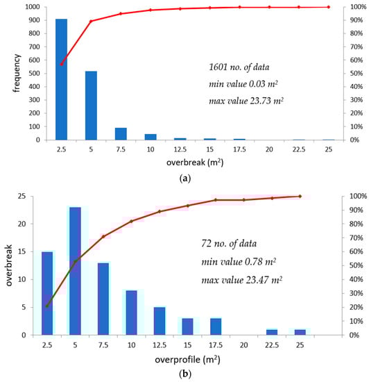 - From the histogram shown in Figure 12a, it can be concluded that the frequency of occurrence of overbreaks in the range of 0 to 5.0 m2 accounts for the largest proportion, and it constitutes almost 90% of the analysed data (among which, 0–2.5 m2 constitutes 56% of the total data). In the case of registered geological overbreaks (Figure 12b), overbreaks of 0–5.0 m2 make up 52% of the measured data.