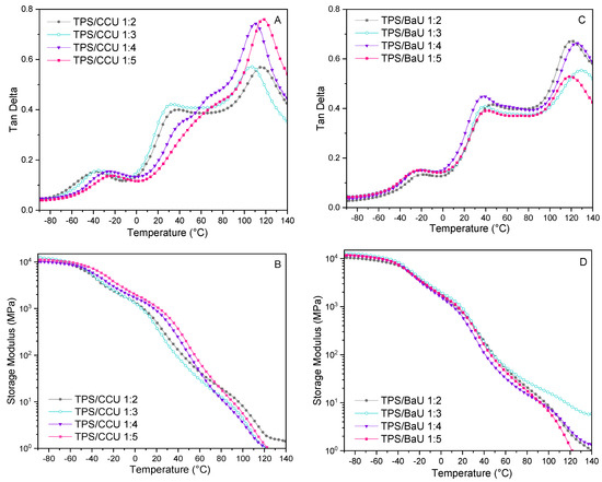 DMTA curves (A) Tan δ for TPS/CCU; (B) Tan δ for TPS/BaU and (C) Storage modulus − E’ for TPS/CCU; (D) Storage modulus − E’ for TPS/CCU; The analysis was performed on thermocompressed TPS films.