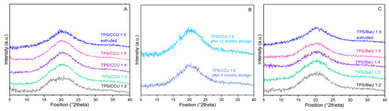 XRD patterns for the films plasticized with DESs: (A) based on CC with different U content; (B) TPS/CCU 1:5 after storage at ambient conditions; (C) based on Ba with different U content.
