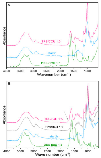 FTIR-ATR spectroscopy results for DES, starch and thermoplasticized starch with DES are presented in Figure 3. The analysis was performed to investigate if some derivatization of starch occurred. In Figure 4A, there is a comparison of the TPS plasticized with CCU 1:5 with the unmodified starch. For the TPS there is a band of bending N-H (amide-II region) with a peak at 1624 cm−1 and stretching C-N (amide-II region) groups at 1458 cm−1, originating from U in DES. In the TPS, there is a shift in these peaks towards higher wave numbers in comparison with the DES due to a weakening of hydrogen bonds between DES component and the formation of new bonds with the polysaccharide OH groups [5]. There are no new peaks for TPS plasticized with all the CC-based eutectics with different U contents (data not shown). Figure 4B shows the comparison of TPS plasticized with anhydrous betaine and urea with native starch and the plasticizing eutectic.