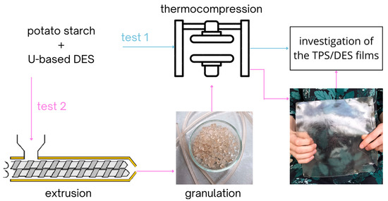 TPS/DES films were prepared as follows: starch and U-based mixture (35 pph per dry starch) were placed in a mortar and mixed to obtain a homogenous composition and then placed into polypropylene vial, where they were sealed and stored for 24 h at ambient conditions. The premixtures were thermocompressed with a hydraulic press (RemiPlast S.C., Czerwonak, Poland) at 140 °C and 12 tons (153 bars) for 5 min; they were then cooled down to 85 °C under pressure, after which the obtained films were stored in a climate chamber for 7 days (25 °C, RH 50%). The methodology is presented in Scheme 1 as test 1.