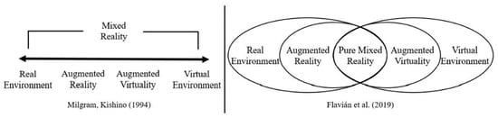 In this study, we focused on optical-see-through MR HMDs. These devices are equipped with see-through capabilities where computer-generated graphics can be optically superimposed onto the real world [35]. Flavian et al. [37] described this technology as pure mixed reality (PMR), characterized by the integration of digital objects into the real world so that they are indistinguishable from real objects, as shown in Figure 1. The authors also introduced an updated reality–virtuality continuum in which all realities appear independently, including PMR. Among immersive displays, recent studies have stated that MR-enabled HMDs have great potential to be used for retail purposes and will change the face of retail in the next ten years [2].