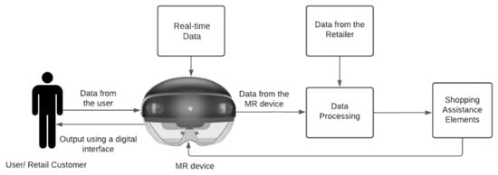 The MR device is used to collect data while also producing output for the user. The back-end computational system device synthesizes real-time data in addition to the data from the retailer to enhance the shopping journey of the user in the form of different shopping assistance elements that can be accessed by the user through the MR device. This concept is depicted in Figure 2.