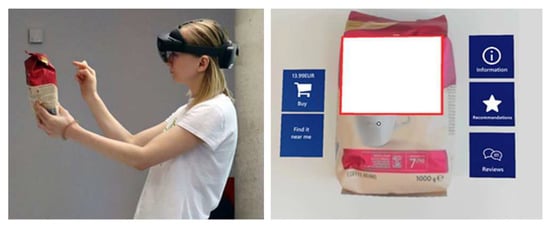 The system is programmed with Unity [70] and MR Toolkit (MRTK) [71]. It uses image recognition technology and the Vuforia software development kit [72] to identify the product of interest; Vuforia-based image recognition systems “are able to detect objects with maximum accuracy” (p. 479) [73]. As shown in Figure 4 (left), the product of interest is recognized once it enters the user’s field of view. More specifically, the system identifies the product’s image, which had previously been added to its database.