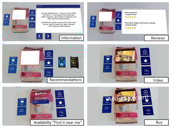 Followed by the recognition of the product of interest, the MR shopping assistant is required to provide information that is not currently available in physical stores, but is in online resources, bridging the gap between digital and physical retail [19]. We extracted seven major design features in the proposed MR shopping assistant system, which define the second requirement (R2): product information, reviews from previous customers, recommendations for alternative or additional items, a commercial video, the shopping cart, the buy button, and the product’s availability. These features should be integrated into the system in the form of a user interface that can be used by the customers. These features are derived from e-commerce platforms [50] and are described in Table 1 [58].