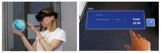 Figure 5. Design features within the MR assistant from the user’s perspective. - Virtual shopping cart—The virtual cart feature is designed towards achieving gamification, which can help users engage and improve their overall shopping experience [75]. The hand gestures used in this interaction are explained in the next section: R3. The shopping cart is permanently accessible with the hand menu gesture. When the user opens their hand in the FOV, a rotating sphere appears in the middle of the user’s open palm. When the sphere is touched with the other hand, using the touch gesture, the cart window renders in front of the user (see Figure 6, right). With the drag gesture, users can grab, move, rotate, and resize the cart window. Customers can scroll through the list of items that have been added to the cart. The items on the list are displayed with their respective quantity and price. The window also shows the total price of the purchase. As shown in Figure 6 (right), the button with the pin symbol allows users to change between a “static” or “follow me” mode. Pinning the virtual shopping cart means selecting the static mode, which forces the cart window to stay in a specific cartesian position in relevance to the environment. In the “follow me mode”, the shopping cart window follows users as they move around the shopping environment. The system tracks the position of the user and adjusts the position of the cart window accordingly. Consequently, the cart window stays in the user’s field of view and can be reached by near-touch interaction.