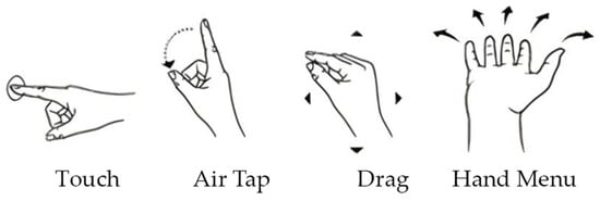 The interface was developed with a basic color scheme, size references, and fonts from the standardized toolkit (i.e., MRTK). The hand gestures that facilitate the NUI in the application are depicted in Figure 7.