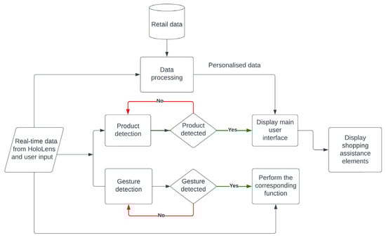 Now, the overall flow of the system can be understood, as shown in Figure 8. The real-time data from HoloLens help the device to carry product and gesture detection. Once a product or a gesture is recognized by the device in its field of view, the corresponding function is triggered, as mentioned in Section 4.2.1, Section 4.2.2, Section 4.2.3. The data from the HoloLens also get fed to the data processing unit, which along with the retail data, facilitate personalization for the user. The ultimate aim of the system is to display interactable shopping assistance elements. The user interaction with the system is shown in Video S1.