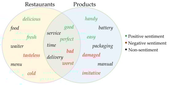 The task of sentiment classification in natural language processing (NLP) involves determining whether a sentiment is positive or negative [1]. Its uses have spread across a wide range of domains, from politics and sports to business and health care. However, a sentiment classifier that has been trained to perform well in one domain may perform worse when applied to another, since sentiment classification is a domain-specific problem [2]. Even with the significant advances made in recent supervised deep learning models, these models still need a large number of labeled samples for training to attain excellent outcomes. Additionally, it is costly and time-consuming to handle domain dependency by annotating samples for every new domain. The use of domain adaptation is valuable for situations in which there are many labeled samples in a field that has been extensively investigated (i.e., a source domain) but none in the field of interest (i.e., the target domain). In such a case, domain adaptation trains a model that is sufficiently resistant to feature mismatch using both the source-labeled and target-unlabeled samples. Feature mismatch denotes differences between the probability distributions of the source and target feature spaces [3]. In other words, people convey their feelings in various ways across domains using different words [4]. As illustrated by Figure 1, the word “delicious” conveys a positive view in the restaurants domain but not in the products domain.