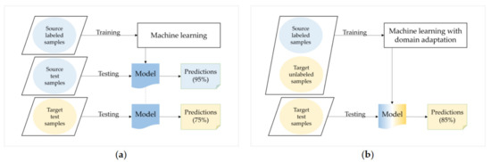 The underlying idea of domain adaptation: (a) a model that performs well in the source domain but worse when tested in the target domain (e.g., a decline in accuracy from 95% to 75%); (b) domain adaptation attempts to train a satisfactory model for the target domain by adding unlabeled target samples to the process (e.g., an improvement in accuracy from 75% to 85%).