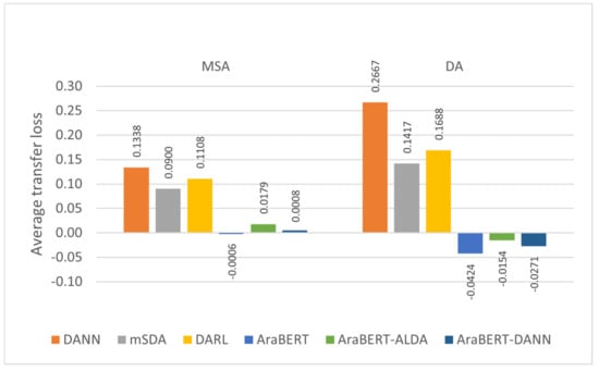 In addition, to assess the performance of a method on MSA compared with DA, as well as its obtained results on Arabic compared with its reported results on English, we calculated the average transfer loss. A transfer loss using two metrics was proposed in a prior study [21]. The first was a transfer error e(S,T), which refers to the classification errors of a classifier trained on a source S and tested on a target T. The second was a baseline in-domain error eb(T,T), which refers to the errors of a classifier trained and tested on T. In turn, the transfer loss between S and T was computed as follows: