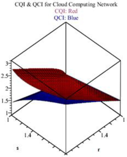 Figure 5 shows the results with clear upper and lower bounds Equations (9) and (10) of the CQI and QCI in red and blue colors, respectively, in the 3D version. As seen in Figure 5, the separation and straight line started from one to three for the ‘r’ and ‘s’ parameters. This would be used accordingly during the construction of cloud computing networks.
