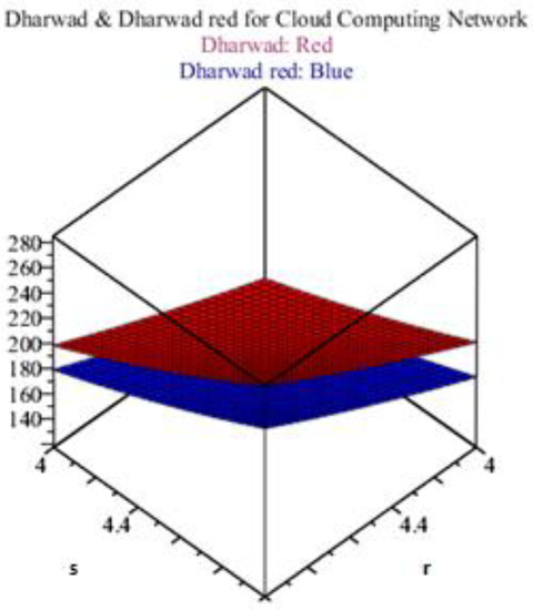 Figure 6 shows the results Equations (9) and (10) of the Dharwad and Dharwadred in the red and blue colors, respectively, in the 3D version, which shows the sharp upper and lowers bounds of a cloud network. It is quite a straight line for high values of parameters ‘r’ and ‘s’, which means that a large number of clouds can be attached for the best characteristics.