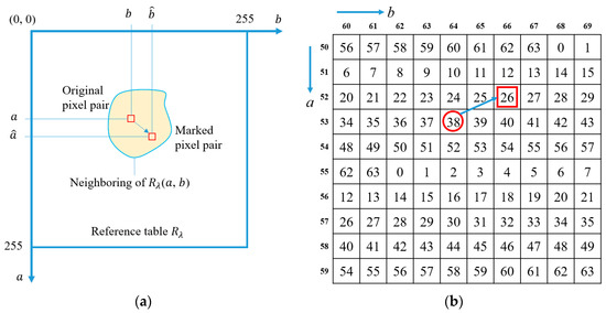 where is a constant, and in this paper. To embed a digit into , first locate a pixel pair in the vicinity of that satisfies and has the minimum distance to . The located is then employed to replace and a marked pixel pair is obtained. When extracting the embedded digit , since and are known, can be calculated by . The schematic diagram of APPM is as shown in Figure 1a.