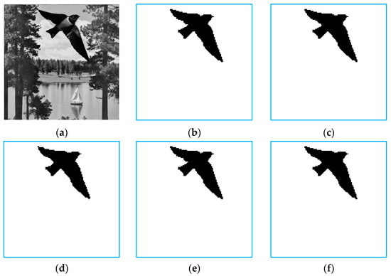 This section shows the detectability comparisons of [25,26,27] and the proposed method. In this experiment, the marked compressed codes of Sailboat are tampered with by adding a bird. Figure 7a,b show the tampered image and the region of tamper, while Figure 7c–f present the detection results of [25,26,27] and the proposed method. The results show all methods can achieve a satisfactory detection result.