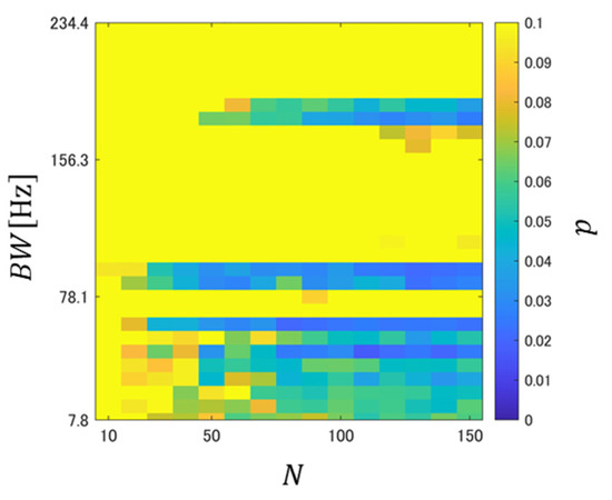 It is confirmed from Figure 3a that the PFHS between BSI-BWI tended to be relatively low, regardless of the liquid intake. This suggests that PFHS was affected by the difference in intestinal conditions on different experimental days. Figure 3b,c show that the PFHS between BSI-ASI was generally smaller than that between BWI-AWI, but it can be confirmed that it tended to be low regardless of N, especially in the range where BW was relatively small. To evaluate the difference between these two systems, a significance test was conducted for the PFHSs between BSI-ASI and BWI-ASI, and the significance level was calculated. The -value was obtained through sampling without replacement in each subject. This approach was repeated 30 times, and the mean p-value was then computed. Figure 4 shows the relationships between the mean -value and BW as a function of N.